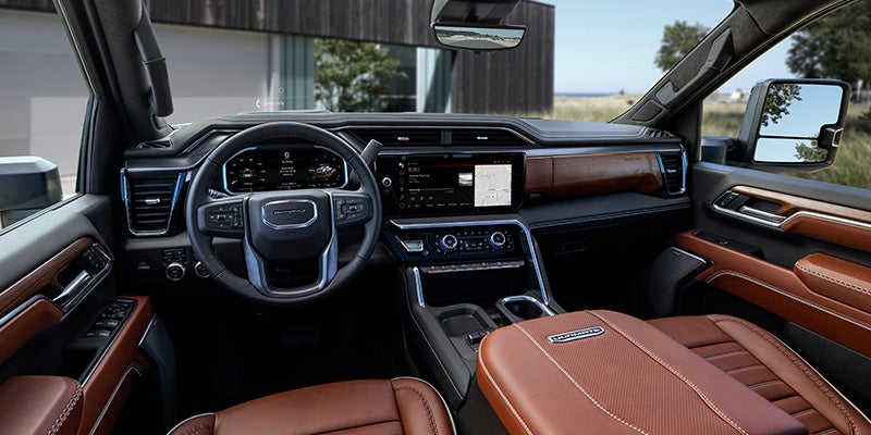 Sierra HD Denali Ultimate’s Alpine Umber interior features full-grain leather seating, plaited contrast stitching, and embossed and laser-etched topographical map patterns of its namesake’s mountain summit.